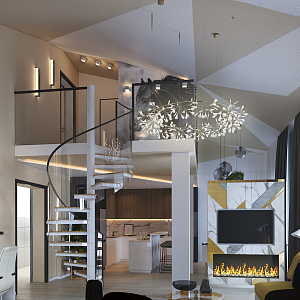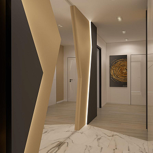 Интерьер кухни с нишей с подсветкой, световыми линиями, рейками с подсветкой, подсветкой настенной, подсветкой светодиодной и с подсветкой в современном стиле, проект «Двухуровневая квартира в современном стиле» №6