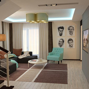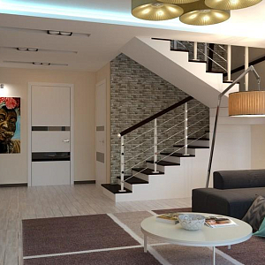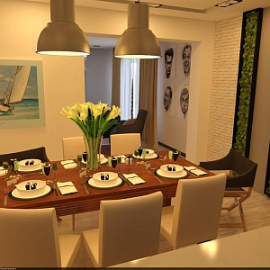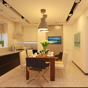 Интерьер кухни c обеденной зоной и светильниками над столом в современном стиле, проект «Дом в современном стиле для молодой семьи» №8