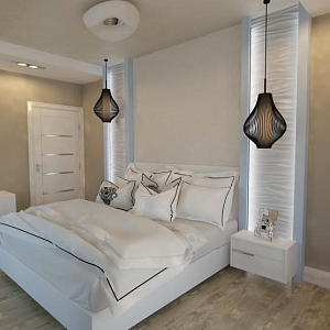 Интерьер спальни с подсветкой настенной, подсветкой светодиодной и светильниками над кроватью в современном стиле, проект «Квартира в современном стиле в ЖК "Челны Яр"» №3