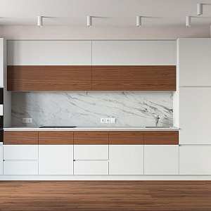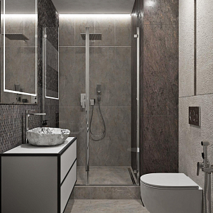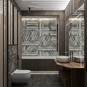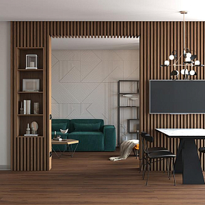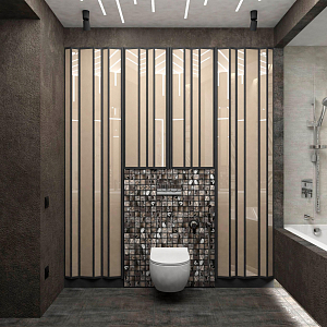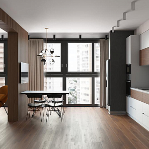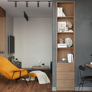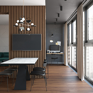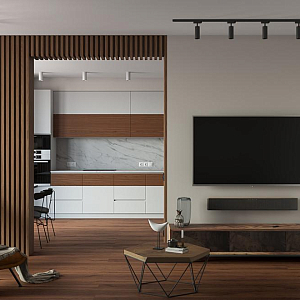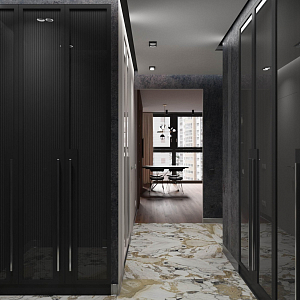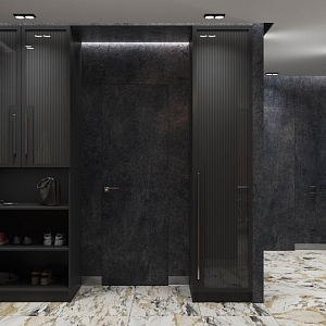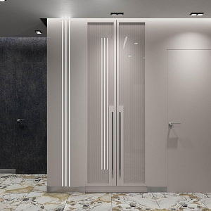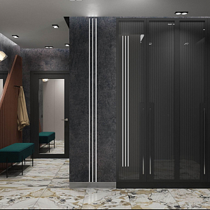 Интерьер прихожей с порогом и рейками с подсветкой в современном стиле, проект «Квартира 110 м2 в современном стиле» №12
