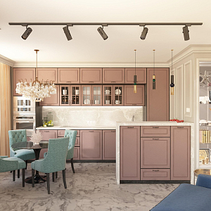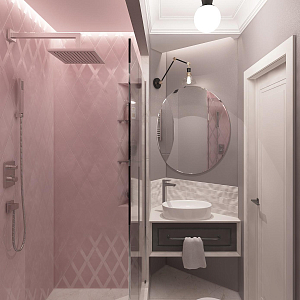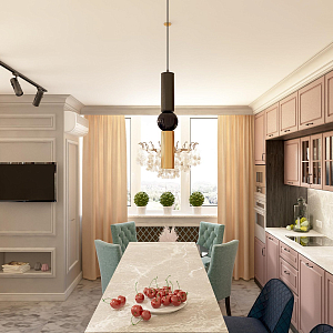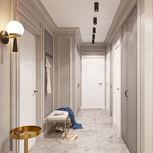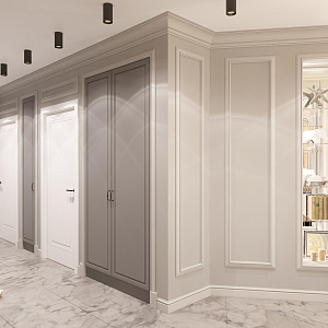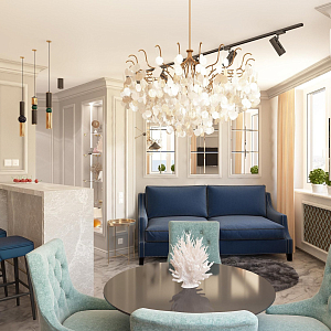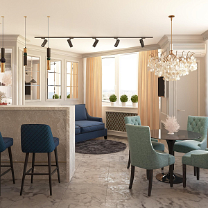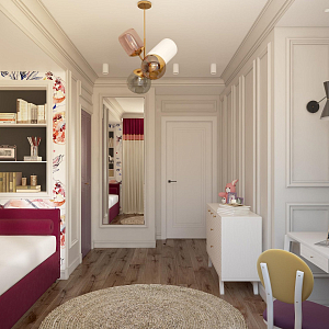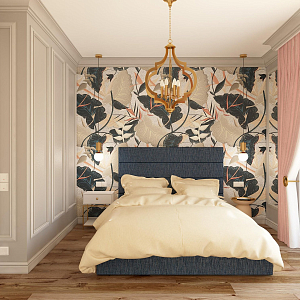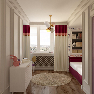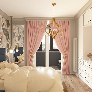 Интерьер спальни с балконом, без дверей, без окна, жалюзи, зонированием, зонированием шторами, кроватью в нише, окном, перегородкой раздвижной, пластиковыми окнами, проемом, с антресолью и три окна в стиле лофт и неоклассике, проект «Квартира в стиле неок №8