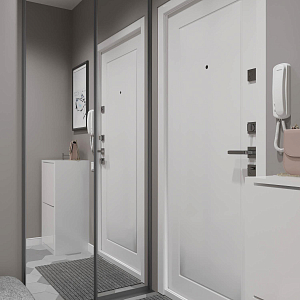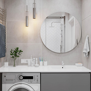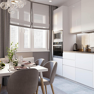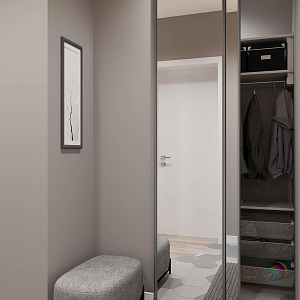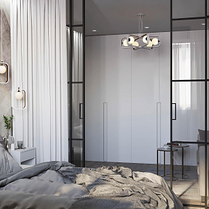 Интерьер спальни с перегородкой, подсветкой светодиодной, с подсветкой, светильниками над кроватью и световыми линиями в стиле лофт и в современном стиле, проект «Квартира в современном стиле в серых тонах» №4