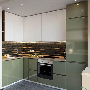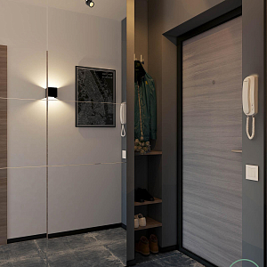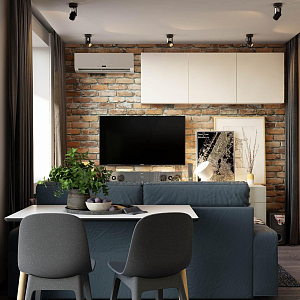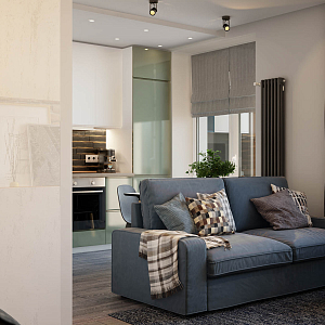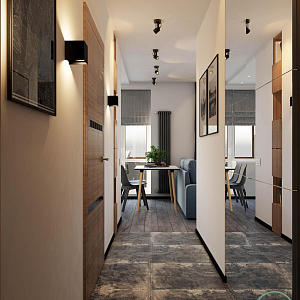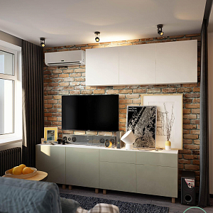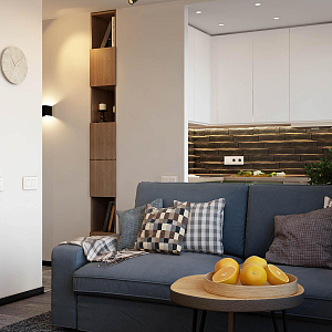 Интерьер гостиной с подсветкой настенной, подсветкой светодиодной, рейками с подсветкой, с подсветкой и световыми линиями в современном стиле, проект «Современная квартира для мужчины» №12