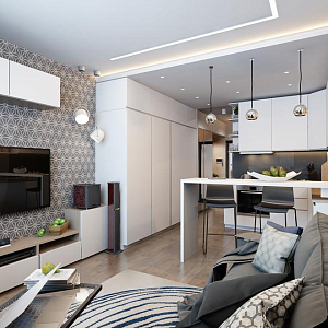Интерьер гостиной с керамогранитом на стену с телевизором, нишей для телевизора, панно за телевизором, подсветкой настенной, подсветкой светодиодной, стеной с телевизором и телевизором на стене в скандинавском стиле, проект «Квартира-студия в скандинавско №19