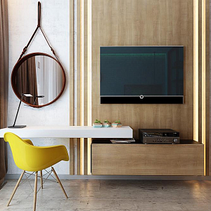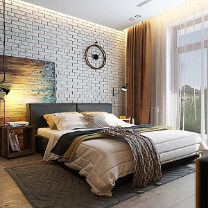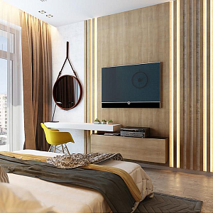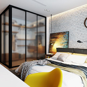 Интерьер спальни с вертикальными жалюзи, зонированием рейками, керамогранитом на стену с телевизором, панно за телевизором, подсветкой настенной, рейками с подсветкой, стеной с телевизором, телевизором на рейках и телевизором на стене в стиле лофт, проект №6
