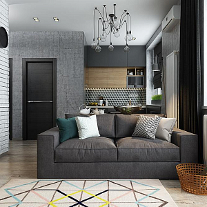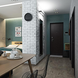 Интерьер спальни с зонированием, кроватью у двери, проходной и светильниками над кроватью в стиле лофт и скандинавском стиле, проект «Квартира-студия для молодой пары в скандинавском стиле» №2