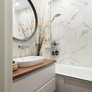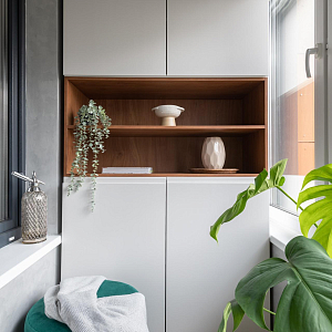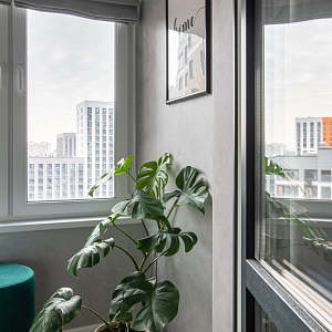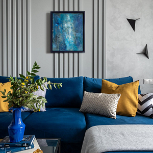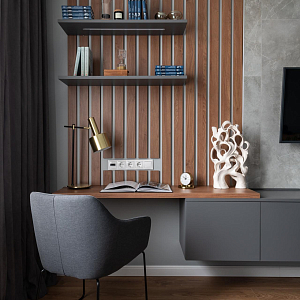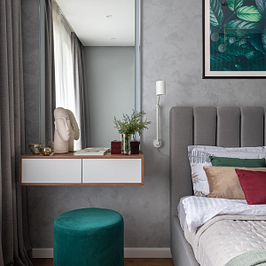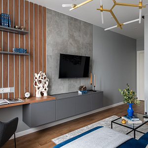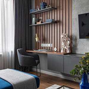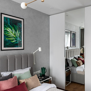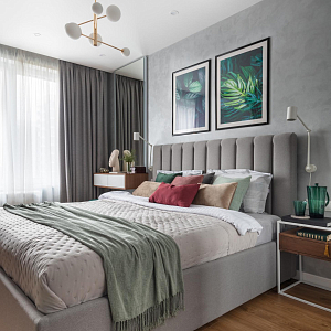 Интерьер спальни с панно за телевизором, стеной с телевизором, телевизором на рейках, телевизором на стене и рейками с подсветкой в современном стиле, проект «Изысканная квартира в современном стиле в серых тонах» №11