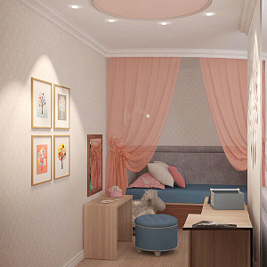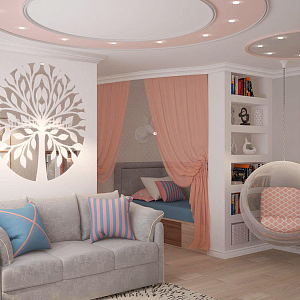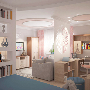 Интерьер гостиной с аркой, подсветкой светодиодной, проемом, рейками с подсветкой, с детской и с подсветкой в современном стиле, проект «Детская в микрорайоне Южный» №2