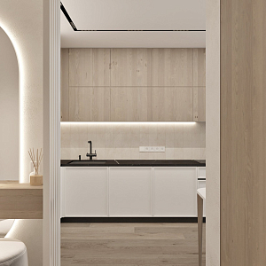 Интерьер кухни cветовыми линиями, рейками с подсветкой и подсветкой светодиодной в современном стиле, проект «Однокомнатная квартира для девушки. Ижевск, ЖК "Маэстро", 40,6 кв.м.» №15