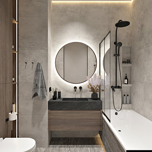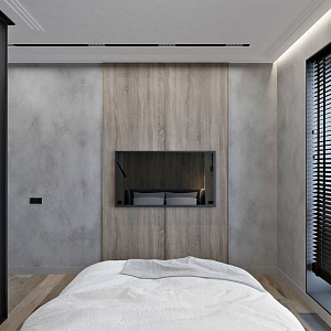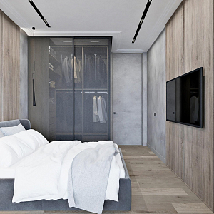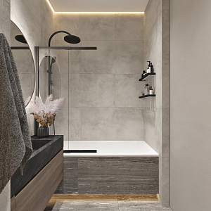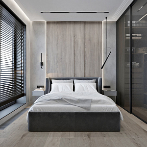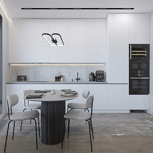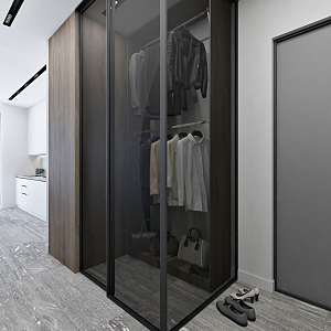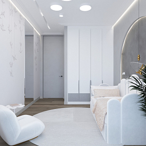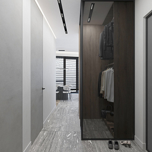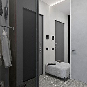 Интерьер прихожей с подсветкой настенной, подсветкой светодиодной, порогом, проходной, рейками с подсветкой, с подсветкой и световыми линиями в современном стиле, проект «Минимализм для молодой семьи в ЖК Wellton Towers, г. Москва» №7