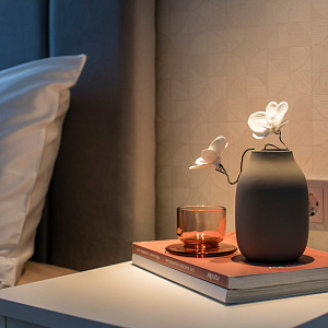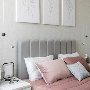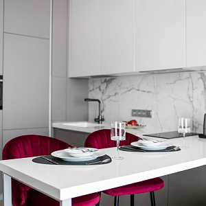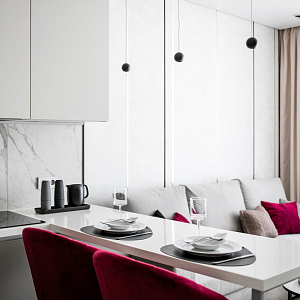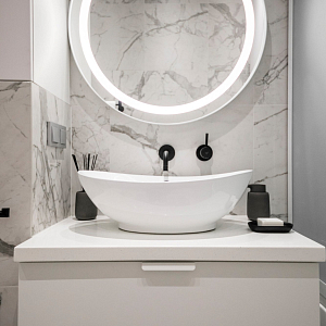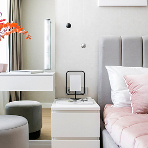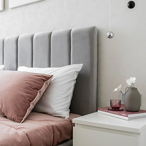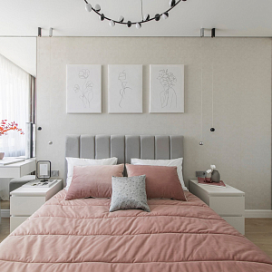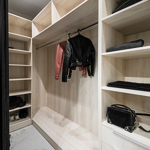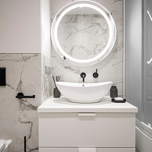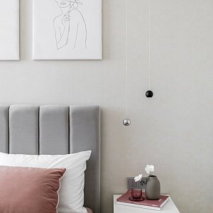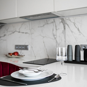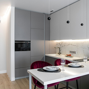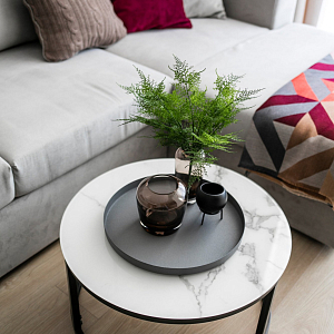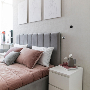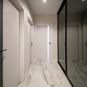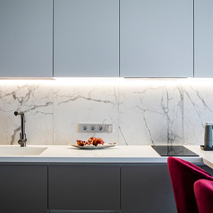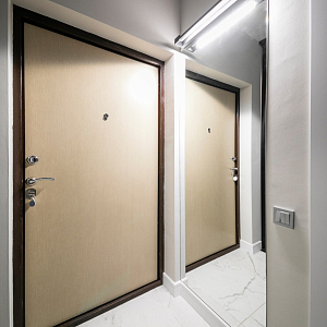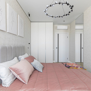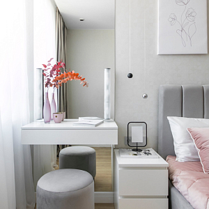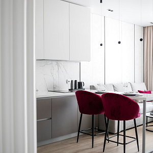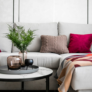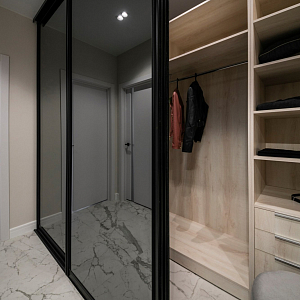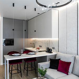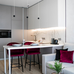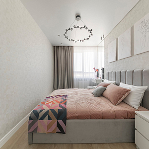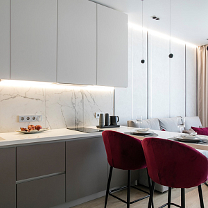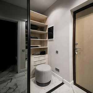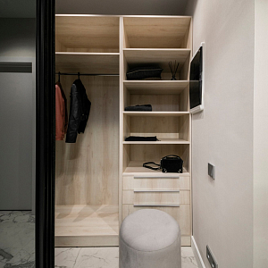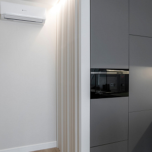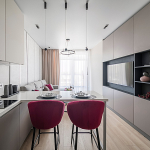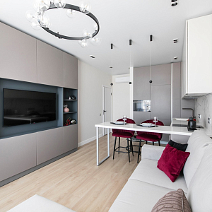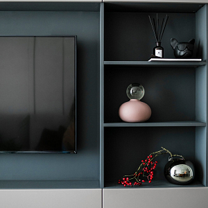 Интерьер гостиной с керамогранитом на стену с телевизором, нишей для телевизора, панно за телевизором, полками над телевизором, стеной с телевизором и телевизором на стене в современном стиле, проект «Однокомнатная квартира для молодой девушки. Ижевск, ЖК №15