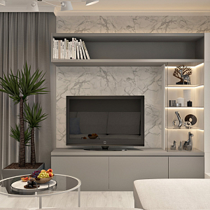 Интерьер спальни cветовыми линиями, рейками с подсветкой, подсветкой настенной и подсветкой светодиодной в современном стиле, проект «Элегантная и современная 3к квартира в ЖК Эверест, г. Ижевск.» №12