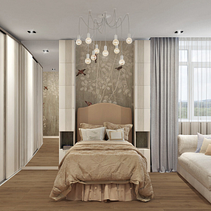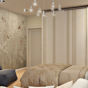 Интерьер спальни с рейками с подсветкой, подсветкой настенной и подсветкой светодиодной в современном стиле, проект «Детская для гимнастки, которая любит играть на гитаре» №2