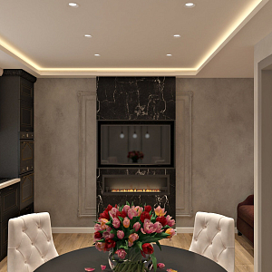 Интерьер коридора с нишей с подсветкой, световыми линиями, рейками с подсветкой, порогом, подсветкой настенной, подсветкой светодиодной и с подсветкой в неоклассике, проект «Классика с современными нотками в 2х комнатной квартире.» №5