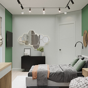 Интерьер спальни c рабочим местом в современном стиле, проект «Спальня в современном стиле в серо-зеленых тонах» №3