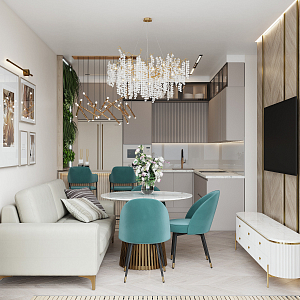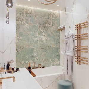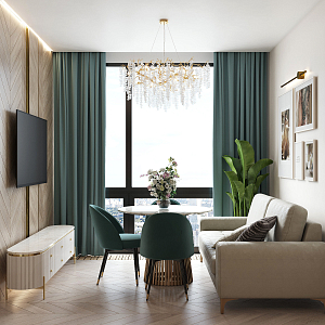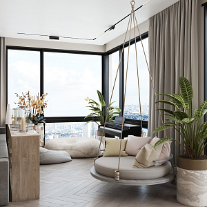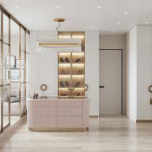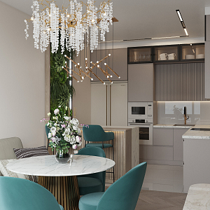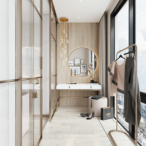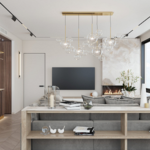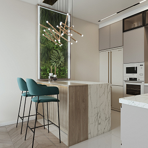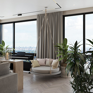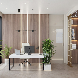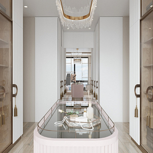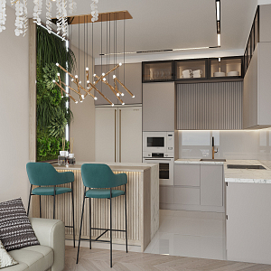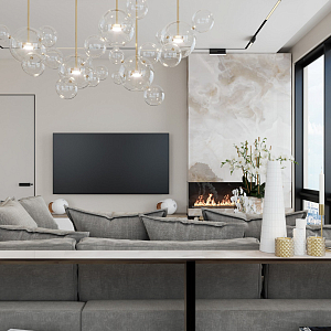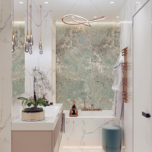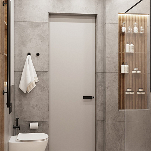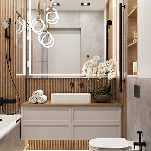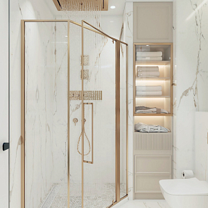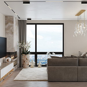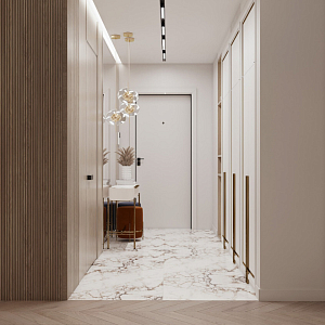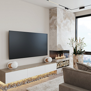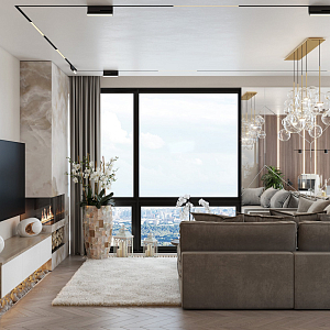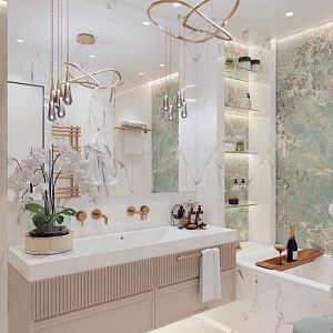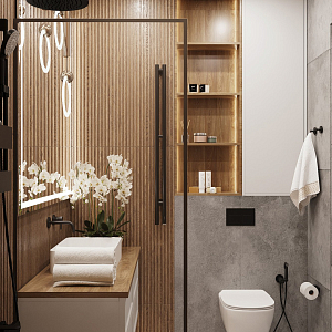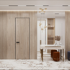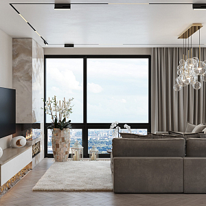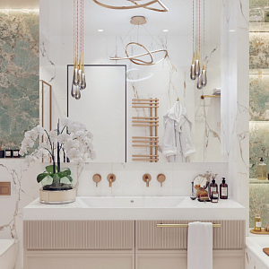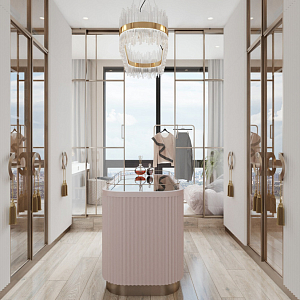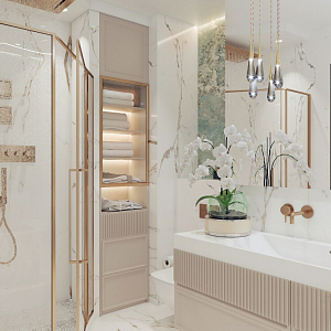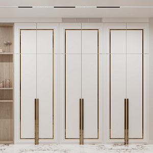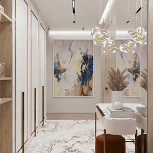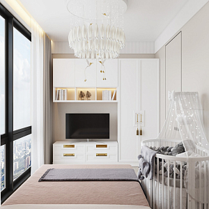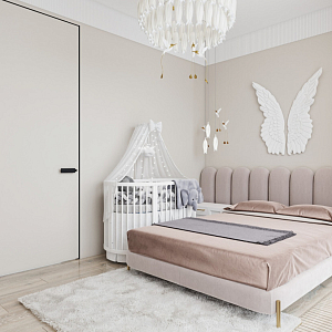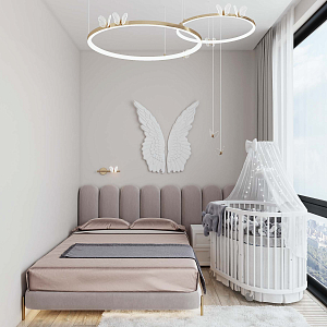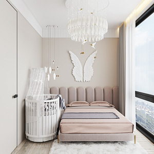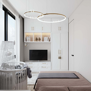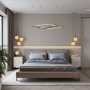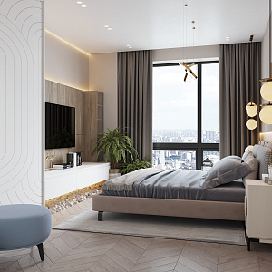 Интерьер спальни с подсветкой настенной, подсветкой светодиодной, рейками с подсветкой, с подсветкой, светильниками над кроватью и световыми линиями в современном стиле, проект «ЖК Фили сити 146м2» №35