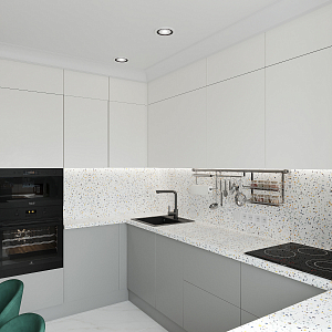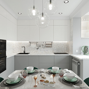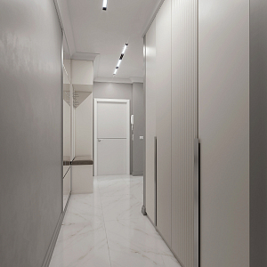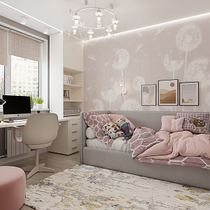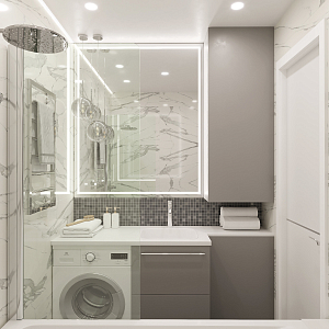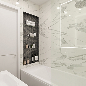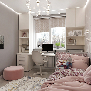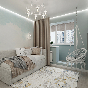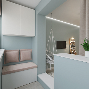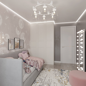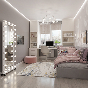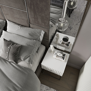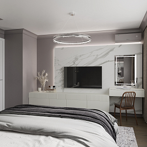 Интерьер спальни с подсветкой настенной, подсветкой светодиодной, рейками с подсветкой, с подсветкой, светильниками над кроватью и световыми линиями в современном стиле, проект «3шка в панельном доме серии П30» №13