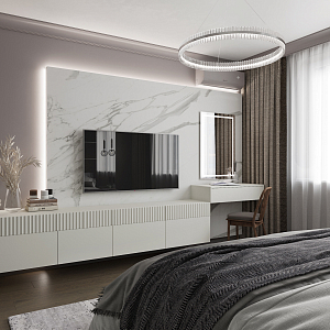 Интерьер спальни cветовыми линиями, подсветкой настенной, подсветкой светодиодной и светильниками над кроватью в современном стиле, проект «3шка в панельном доме серии П30» №19