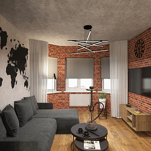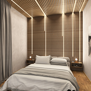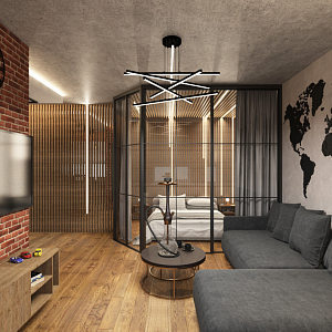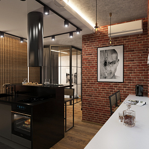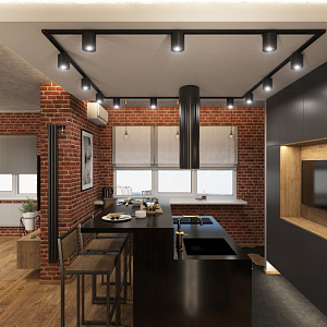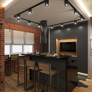 Интерьер кухни cветовыми линиями, рейками с подсветкой, подсветкой настенной, подсветкой светодиодной и с подсветкой в стиле лофт, проект «Квартира студия для молодой пары» №7