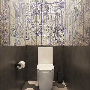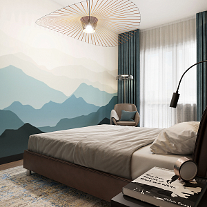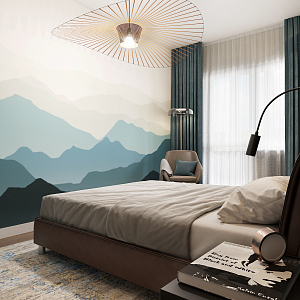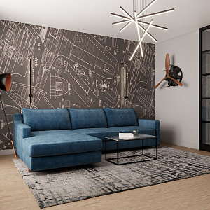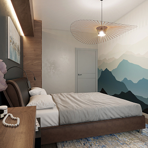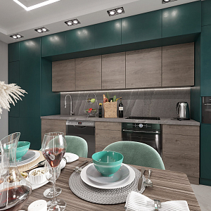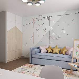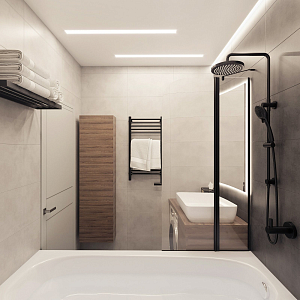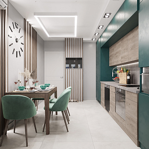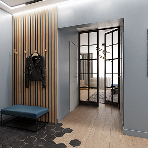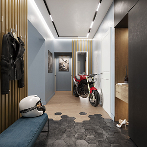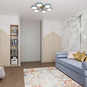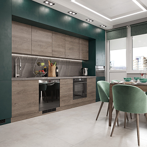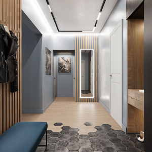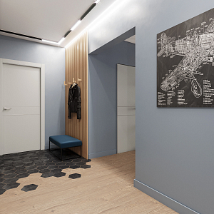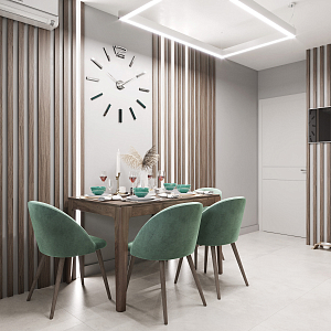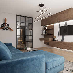Интерьер гостиной с керамогранитом на стену с телевизором, панно за телевизором, подсветкой настенной, рейками с подсветкой, стеной с телевизором и телевизором на рейках в современном стиле, проект «3х комнатная квартира в Жулебино» №29