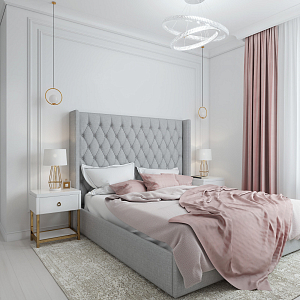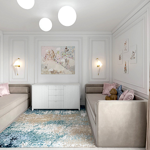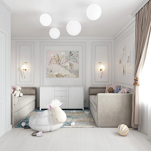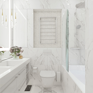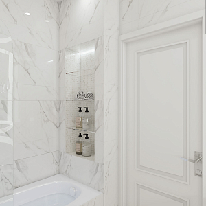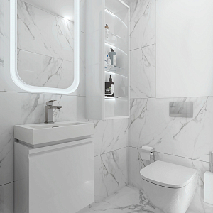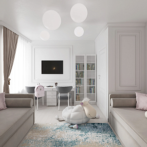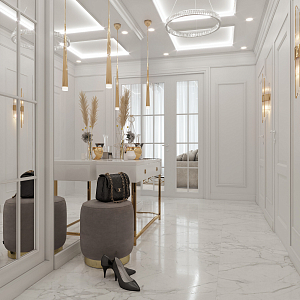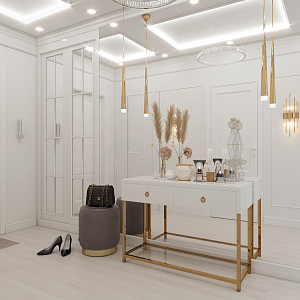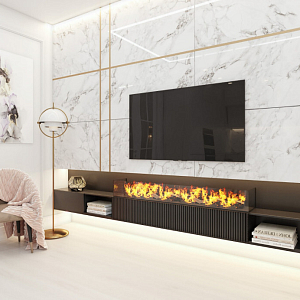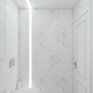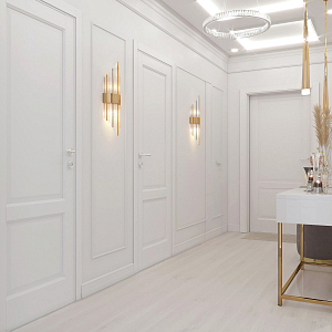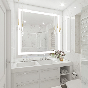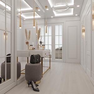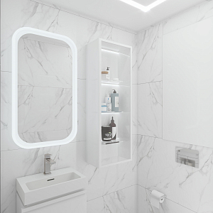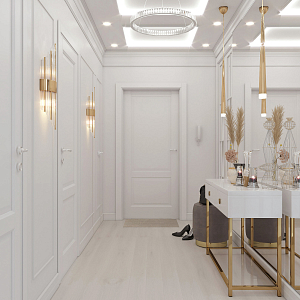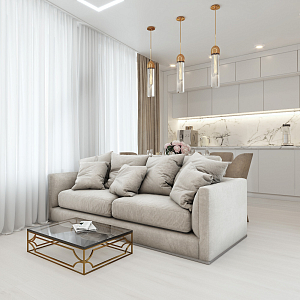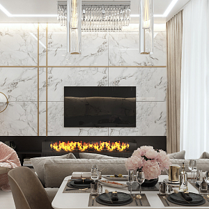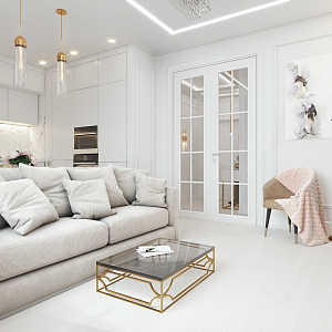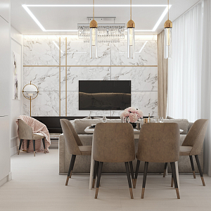 Интерьер гостиной cветовыми линиями, рейками с подсветкой, подсветкой настенной и подсветкой светодиодной в современном стиле, проект «Белая квартира г.Реутов 70м2» №13