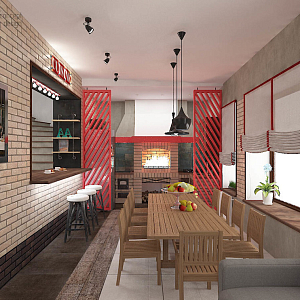 Интерьер гостиной с в деревянном доме, зонированием, зонированием рейками, переговорной и проходной в стиле лофт, проект «Яркий и смелый лофт» №6