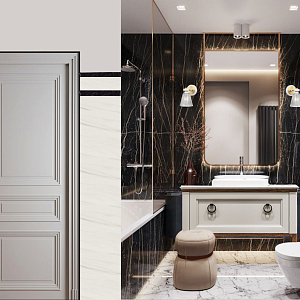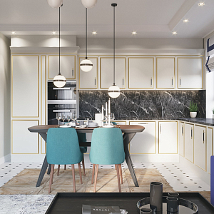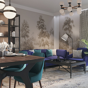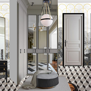 Интерьер гостиной с панно за телевизором, стеной с телевизором, нишей для телевизора, керамогранитом на стену с телевизором и подсветкой настенной в классическом стиле, проект «Трёхкомнатная квартира 75 кв.м. Москва, ЖК Скандинавия» №4