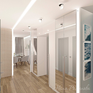 Интерьер коридора cветовыми линиями, рейками с подсветкой, подсветкой настенной, подсветкой светодиодной и с подсветкой в скандинавском стиле, проект «Квартира в скандинавском стиле» №4