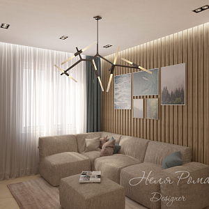 Интерьер гостиной с в деревянном доме, подсветкой светодиодной, проходной, рейками с подсветкой и световыми линиями в стиле лофт и скандинавском стиле, проект «Скандинавский эко стиль» №2