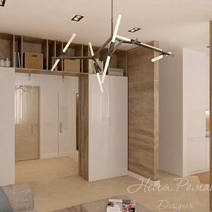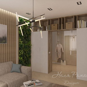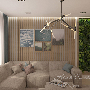 Интерьер гостиной с в деревянном доме, вторым светом, гостиной-прихожей, подсветкой светодиодной, проходной, рейками с подсветкой и световыми линиями в скандинавском стиле, проект «Скандинавский эко стиль» №5