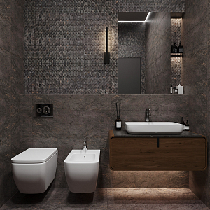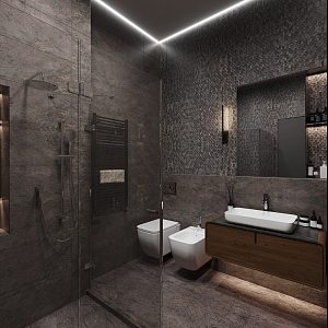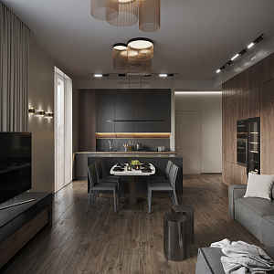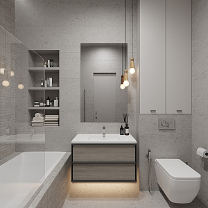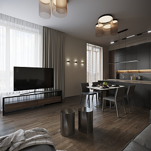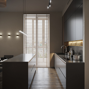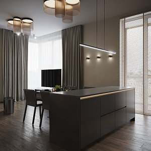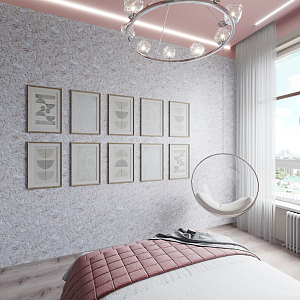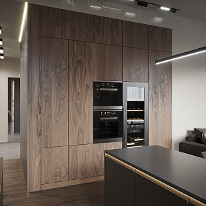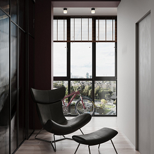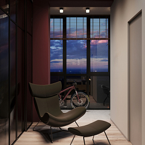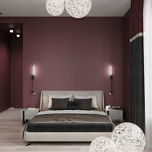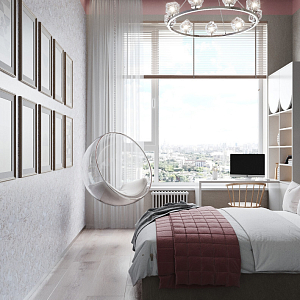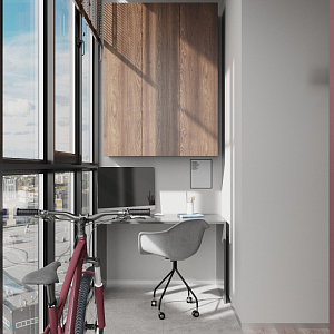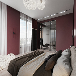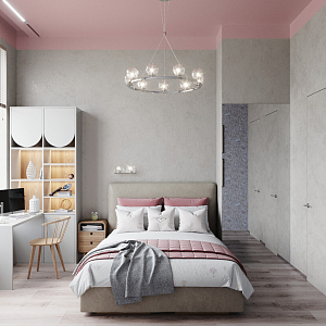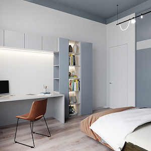 Интерьер спальни c рабочим местом, с кабинетом, с рабочим местом в шкафу, кроватью между шкафами, шкафом напротив кровати и шкафом у кровати в современном стиле, проект «Квартира 140м2 ЖК Life Ботанический сад» №31