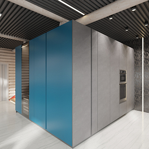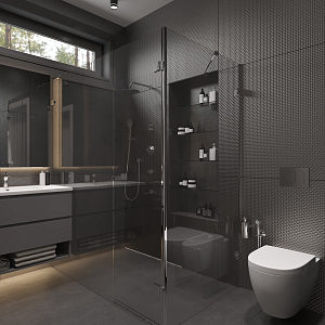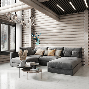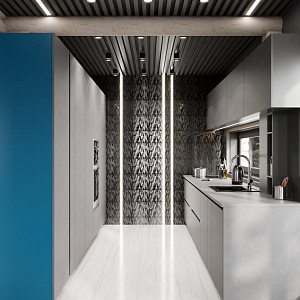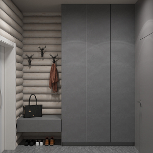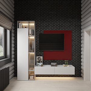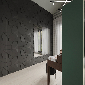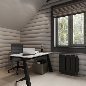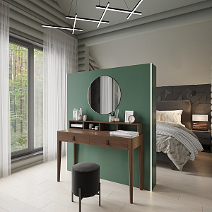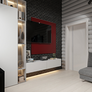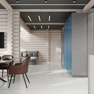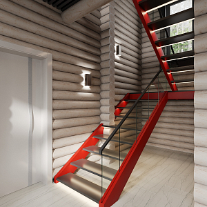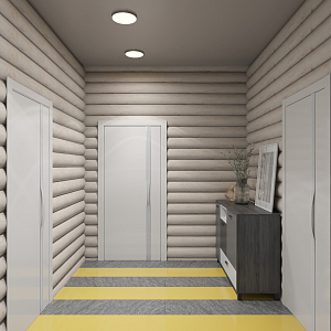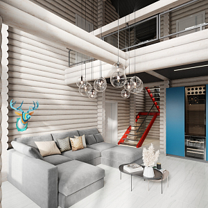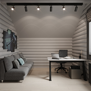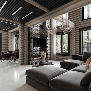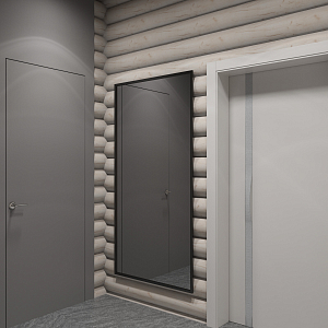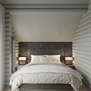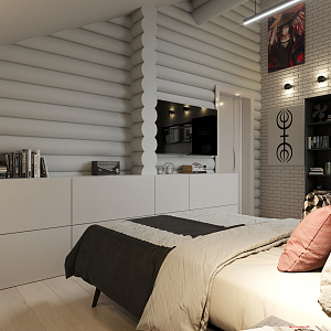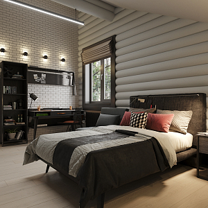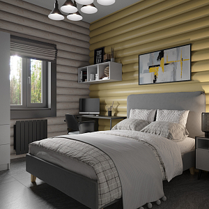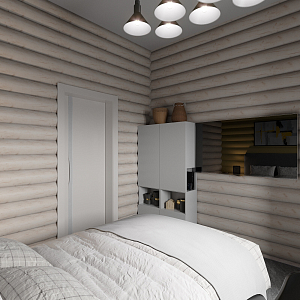 Интерьер спальни с бра над кроватью, кроватью в нише, кроватью у двери, панно за телевизором, светильниками над кроватью и шкафом над кроватью в стиле лофт и эко, проект «Дом из бревна в КП "Золотые Сосны"» №25