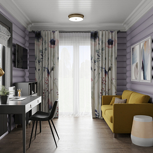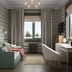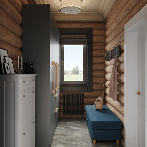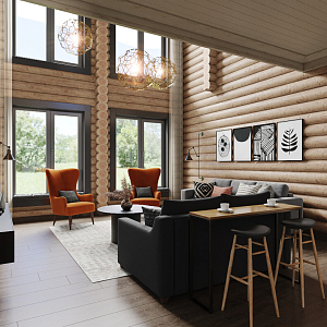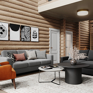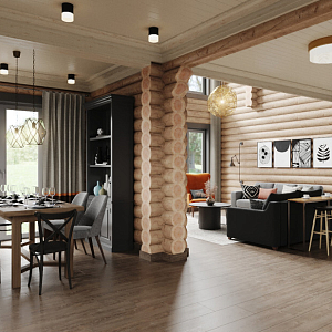 Интерьер гостиной с в деревянном доме и сауной, проект «Дом из бревна в Подмосковном п.Завилово» №12