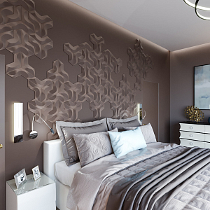 Интерьер спальни с подсветкой настенной, подсветкой светодиодной, рейками с подсветкой, с подсветкой, светильниками над кроватью и световыми линиями, проект «Коттедж, Одинцовский район, 250м2» №12