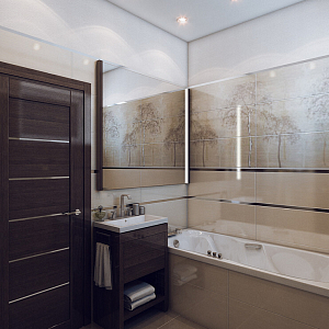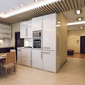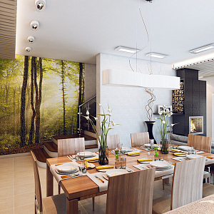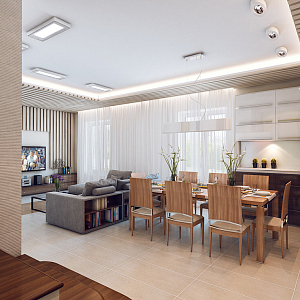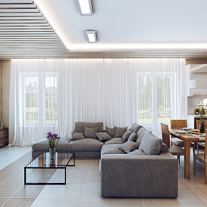 Интерьер гостиной с подсветкой настенной, подсветкой светодиодной, рейками с подсветкой, с подсветкой и световыми линиями, проект «Коттедж 200м2, Мураново, КП "Лесная сказка"» №1