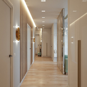 Интерьер коридора с без дверей, проходной, гостиной-прихожей и световыми линиями в современном стиле, проект «Дизайн-проект трехкомнатной квартиры "Мятное настроение"» №2