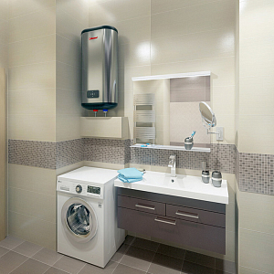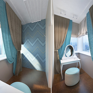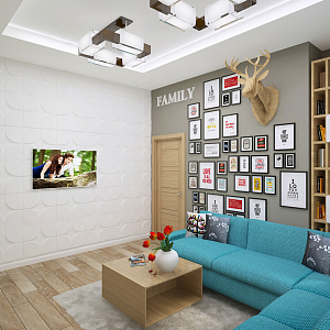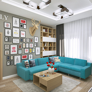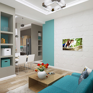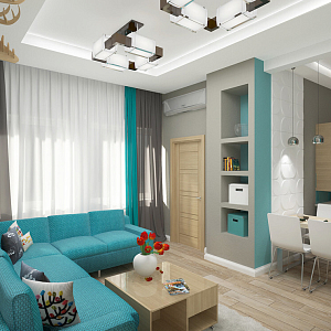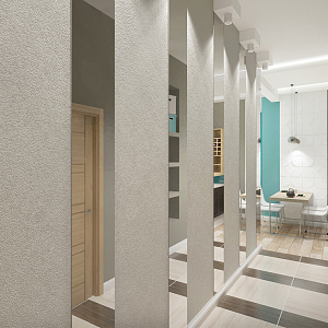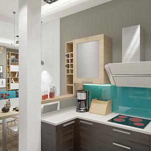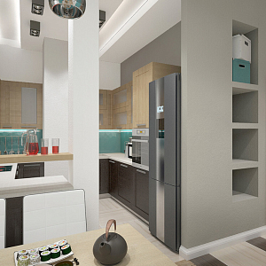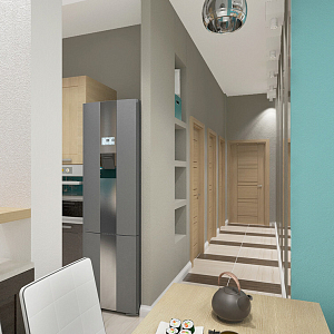 Интерьер с зонированием, проходной, гостиной-столовой и кухней-гостиной с коридором в современном стиле, проект «Квартира по ул. Комсомольская 78» №4