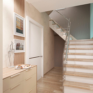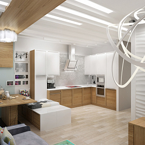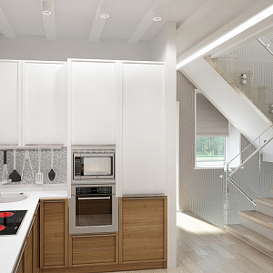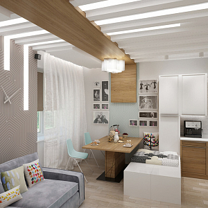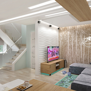 Интерьер гостиной с в деревянном доме, гостиной-столовой, зонированием, зонированием рейками, кухней-гостиной с коридором и проходной в стиле кантри, в стиле лофт и в современном стиле, проект «Таунхаус поселок Тополево» №6
