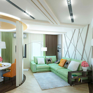 Интерьер гостиной с подсветкой настенной, подсветкой светодиодной, проходной, рейками с подсветкой, с подсветкой и световыми линиями в современном стиле, проект «Квартира в ЖК Riche Ville» №8