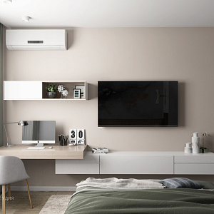 Интерьер спальни с кроватью у двери, с рабочим местом, светильниками над кроватью, шкафом над кроватью, шкафом напротив кровати и шкафом у кровати в эко, проект «Дизайн-проект квартиры 56 кв.м. в г. Тюмень» №19