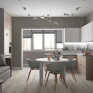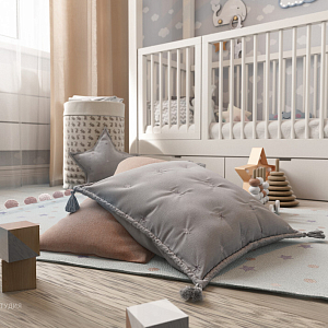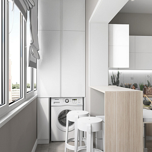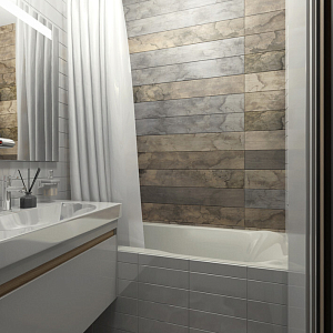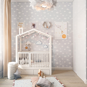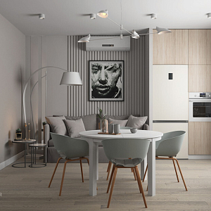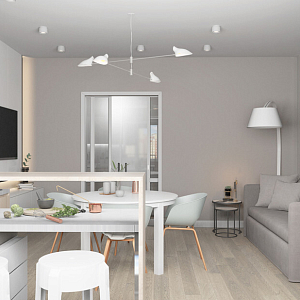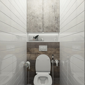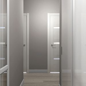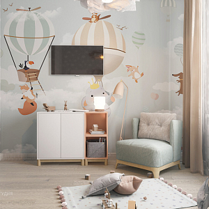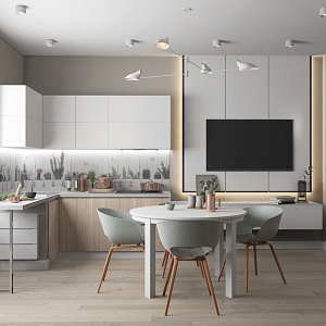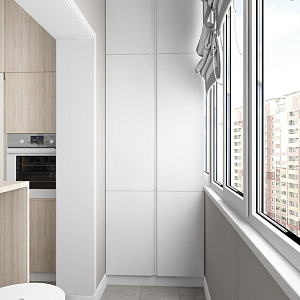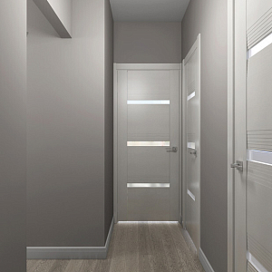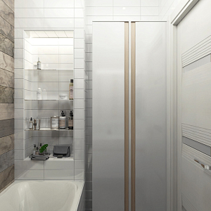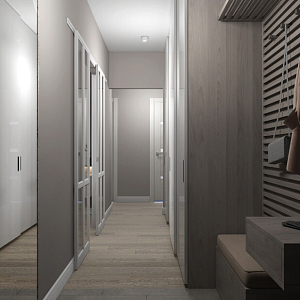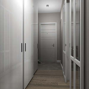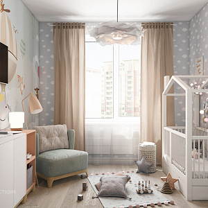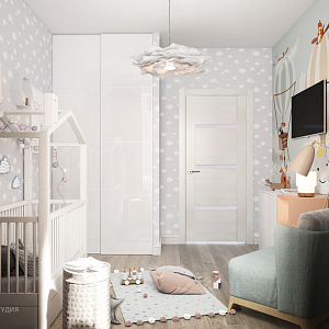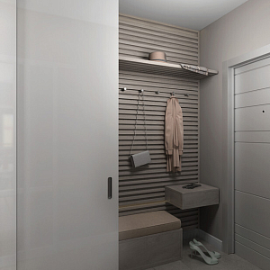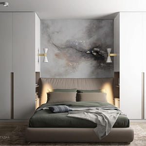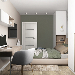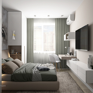 Интерьер спальни c рабочим местом, панно за телевизором, стеной с телевизором, телевизором на рейках, телевизором на стене и нишей для телевизора, проект «Дизайн-проект квартиры 56 кв.м. в г. Тюмень» №24