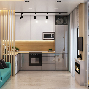 Интерьер гостиной cветовыми линиями, рейками с подсветкой, порогом, подсветкой настенной и подсветкой светодиодной в современном стиле, проект «Дизайн-проект 1 комн. квартиры 40 кв.м. г.Орел.» №17