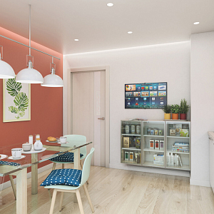 Интерьер гостиной cветовыми линиями, рейками с подсветкой, подсветкой настенной и подсветкой светодиодной, проект «Двухкомнатная квартира в г.Тюмени мкр. "Европейский"» №16