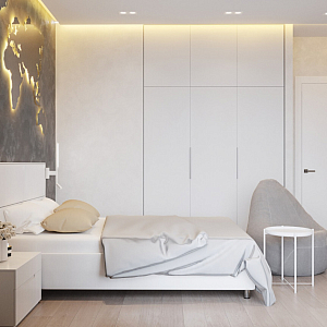 Интерьер гостиной с подсветкой настенной, подсветкой светодиодной, рейками с подсветкой, с подсветкой, светильниками над столом и световыми линиями в современном стиле, проект «Жк Лахта парк» №26