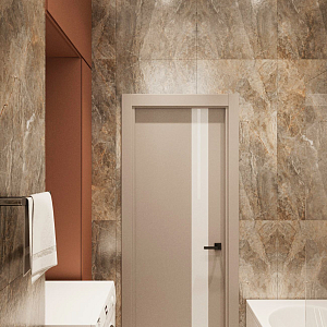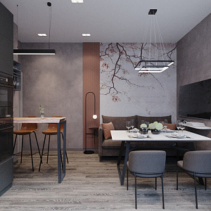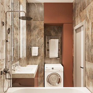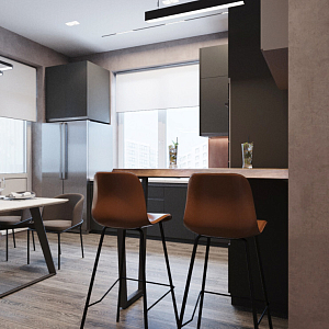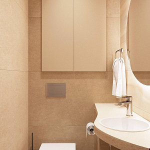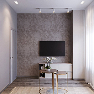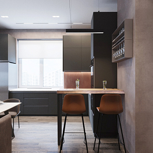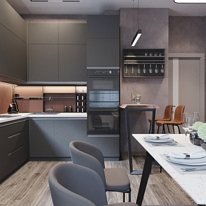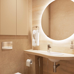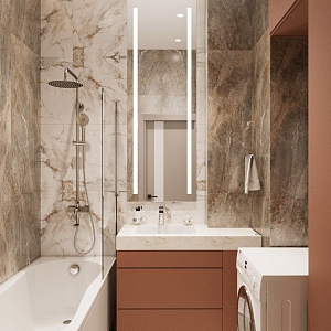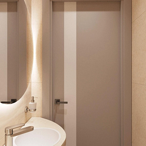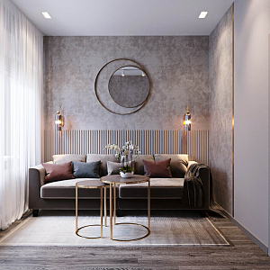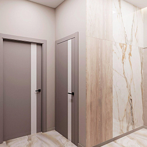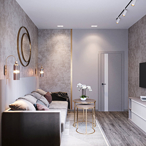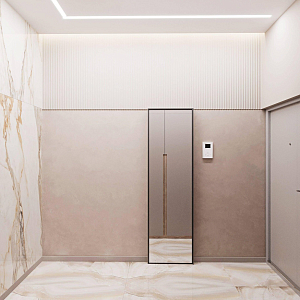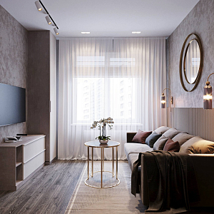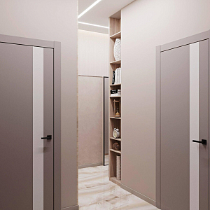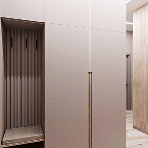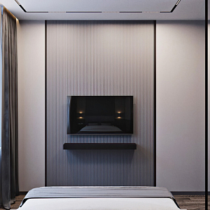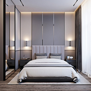 Интерьер спальни cветовыми линиями, рейками с подсветкой, бра над кроватью, подсветкой настенной, подсветкой светодиодной, светильниками над кроватью и с подсветкой, проект «ЖК Статус» №11