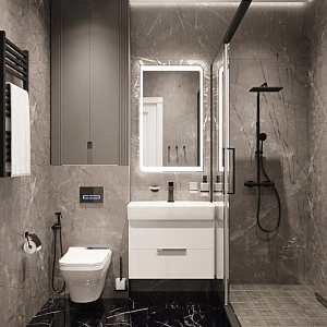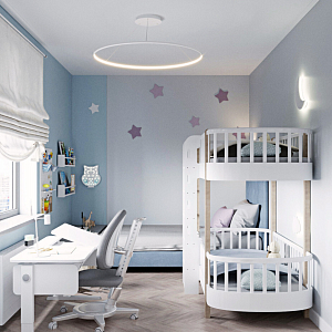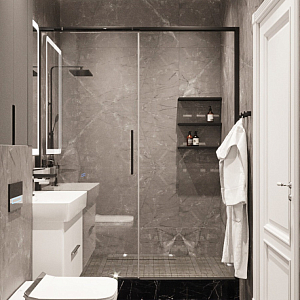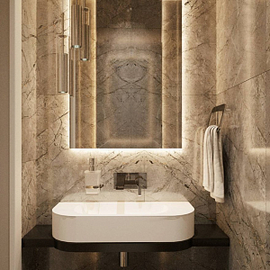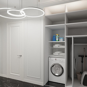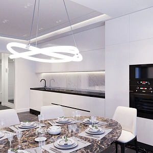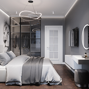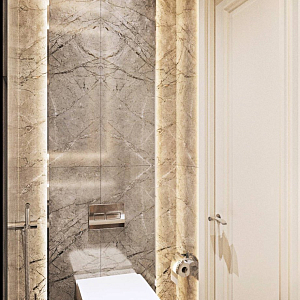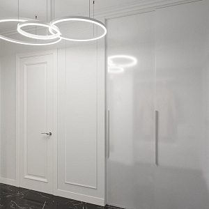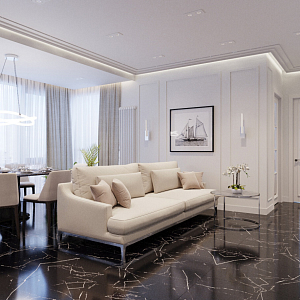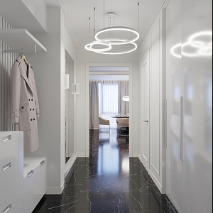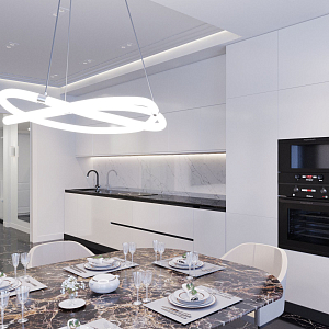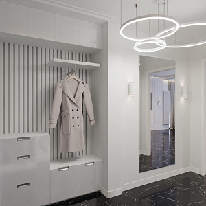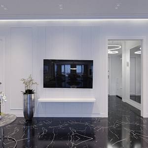 Интерьер гостиной с нишей с подсветкой, подсветкой настенной, подсветкой рабочей зоны, подсветкой светодиодной, рейками с подсветкой, с подсветкой и световыми линиями в современном стиле, проект «Жк Bauhaus» №10