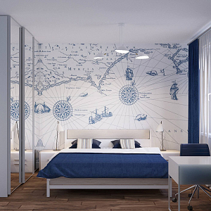 Интерьер спальни c рабочим местом, световыми линиями, подсветкой настенной, подсветкой светодиодной и светильниками над кроватью, проект «ЖК Bonava» №11