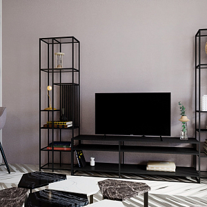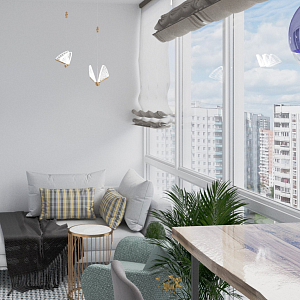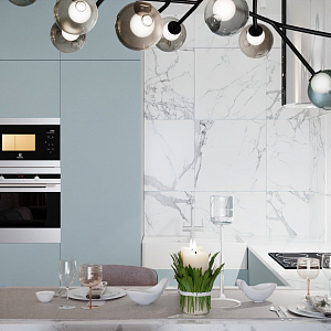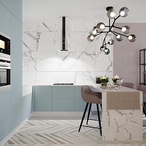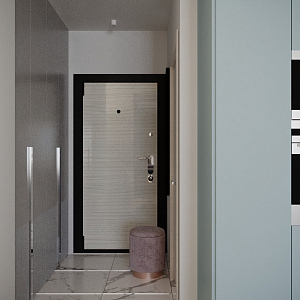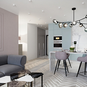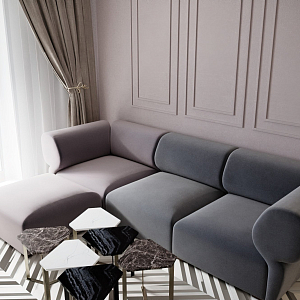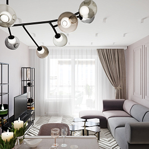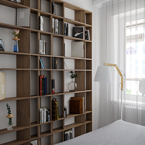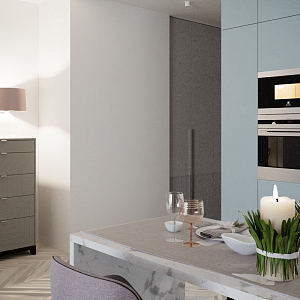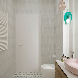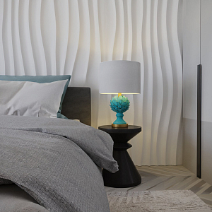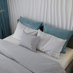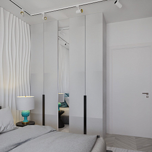 Интерьер спальни с бра над кроватью, панно за телевизором, подсветкой настенной, светильниками над кроватью, световыми линиями и стеной с телевизором в современном стиле, проект «Лазурный пляж» №13