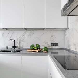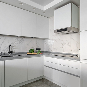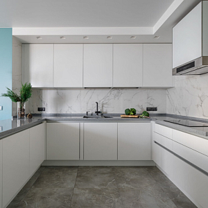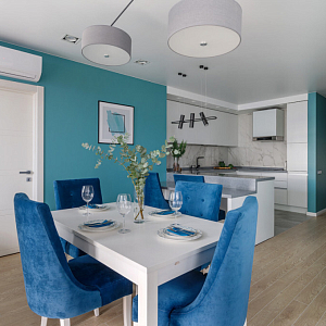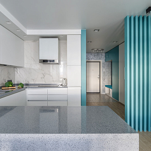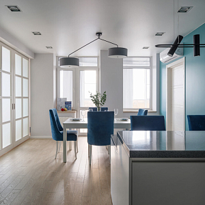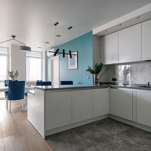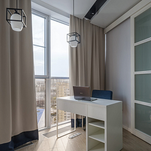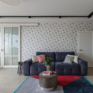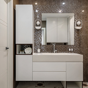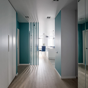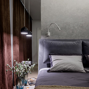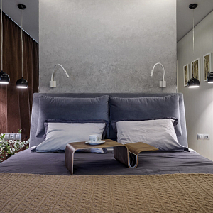 Интерьер спальни cветовыми линиями, рейками с подсветкой, подсветкой настенной, подсветкой светодиодной, светильниками над кроватью и с подсветкой в современном стиле, проект «Современная квартира» №21