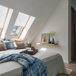 Интерьер спальни с жалюзи и дверными жалюзи в скандинавском стиле, проект «Квартира с мансардой» №12